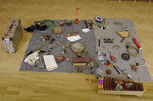 - alltägliche und exotische Geräuscherzeuger wie Plastikfolie, Schneebesen und "Waldteufel",