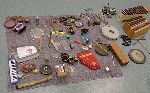Der Umgang mit den von mir zur Verfügung gestellten Klang- und Geräuscherzeugern ist phänomenologisch. D.h. die Instrumente werden ohne Vorurteile auf ihre klanglichen Möglichkeiten und Wirkungen hin untersucht. Ein sachliches Hören auf die unterschiedlichen Phänomene und Wirkungen des Klangmaterials hin wird geschult. Die Klänge werden intuitiv differenziert, katalogisiert und eingesetzt. Daraus entstehen themenbezogene spezifische klangliche Polyphonien, die die sowohl improvisatorisch als auch kompositorisch sein können.