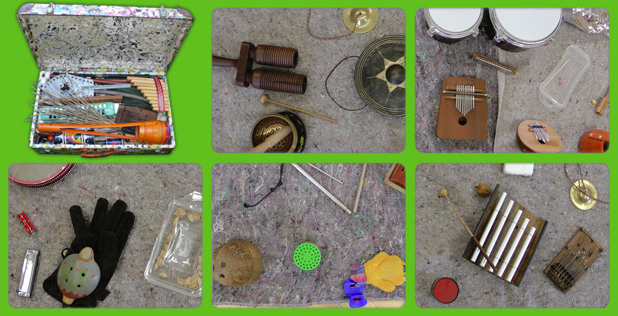 Instrumente aus dem Klangkoffer, ergänzt durch Schulinstrumente der IGS Köln-Holweide (Schuljahr 2013/14)
