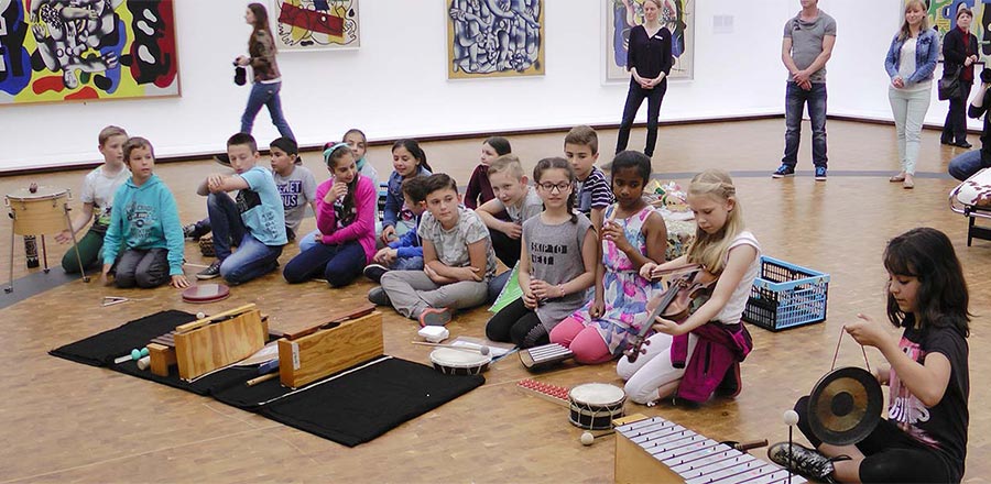 Es folgte der erste Museumsbesuch mit einer Führung von Christine Wolf von der Museumsschule Köln und anschließender praktiscer Arbeit in der Museumswerkstatt. Die Kinder untersuchten mit der Kunstlehrerin Formen, Farben, Material und Wirkung von Kunstwerken von Yves Klein, Antoni Tápies, Ernst Wilhelm Nay und Fernand Léger und erfuhren vieles über diese Künstler. Direkt im Anschluss an den Museumsbesuch wurden die Kinder in der Museumswerkstatt in 4 Gruppen eingeteilt. Jede Gruppe konzentrierte sich auf ein Kunstwerk. Die Instrumente befanden sich in der Werkstatt, und die Kinder konnten sofort mit den Verklanglichungen beginnen.